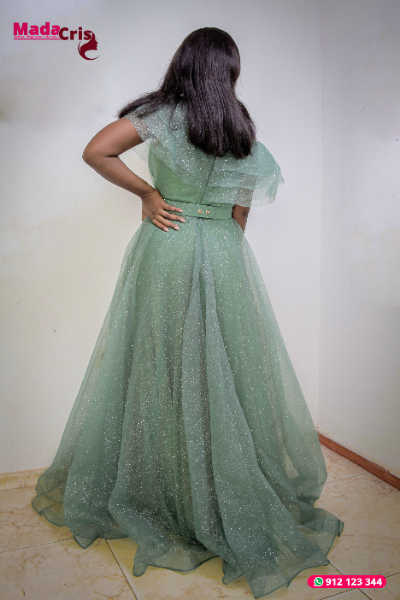 Ele e ideal para galas noturnas, pois o seu brilho realca a cor verde clara, decote canoa com fecho na parte de tras e um cinto que se torna um acessorio indispensavel. Ao usar o aventurina, sugerimos que opte por acessorios leves e de cor prata